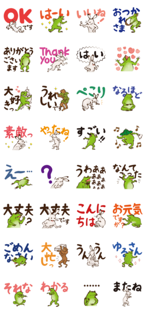 人気の鳥獣戯画をモチーフにした、和風のでか文字スタンプです。文字が大きくて見やすい!使いやすい!可愛いウサギ、カエル、サルがあなたの日常会話を彩ります。