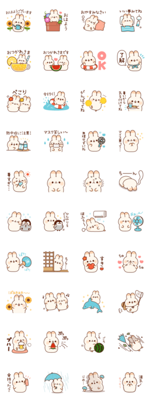 いつでも傍で寄り添って癒しをくれるうさぎさんのスタンプ第四段!夏に使える可愛いスタンプが揃っています♪(こっそり心くばりペンギンもいます)