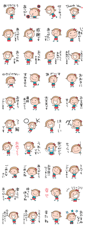 幅広い年代の女性が女の子らしく、そして明るく「ありがとう」を伝えたい時にとても役に立つスタンプだと思います。