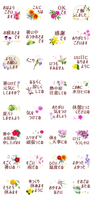 日常よく使う言葉の他に暑中お見舞い.涼しくしてね.熱中症に注意.水分とってね.暑い中お疲れ様など夏ならではの労わり気遣い言葉が多いです。酷暑残暑7月8月9月10月に最適