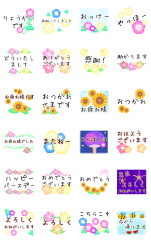 背景動くエフェクトスタンプ♥夏/敬語/大人/あさがお/ハイビスカス/ひまわり/毎日使えるかわいい/了解/ありがとうございます/よろしくお願いします/おしゃれ/お疲れ様です