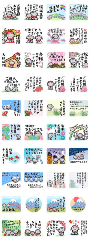合格祈願、卒業、入学、成人、就職、誕生日などお祝い、暑中、寒中、余寒お見舞い、年末年始、クリスマス、ハロウィン、喪中など、毎年使える季節のご挨拶スタンプです。Miyuki より発売