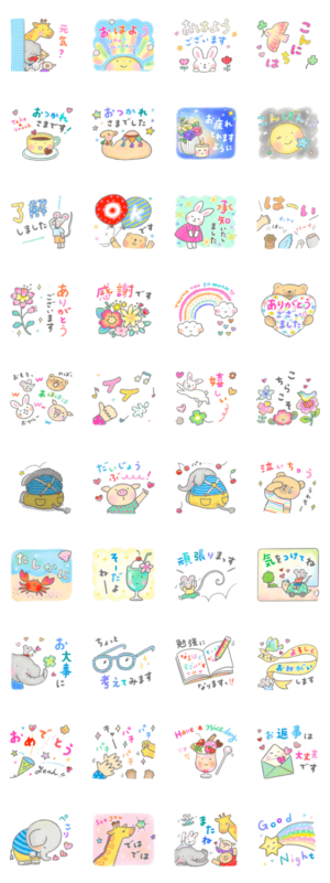敬語多めで日常使いにとっても便利!仲良し動物たちのカラフルスタンプです。明るいパステルカラーで、トークを盛り上げてね♪