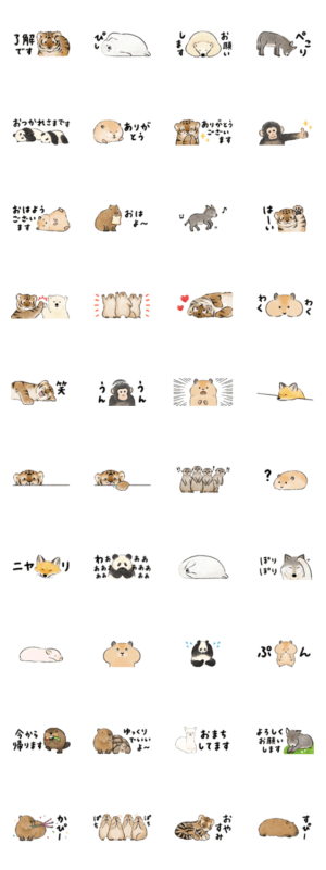 虎、ハムスター、カピバラ、ロバ、チンパンジー、プレーリードッグ、キツネ、ミーアキャット、オオカミ、ビーバーなど。