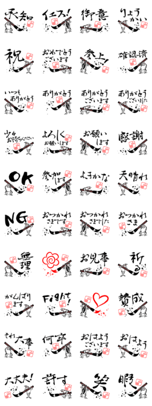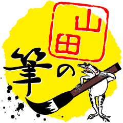 「山田」さん専用落款付き。鳥獣戯画の蛙がしたためし書。デカ文字シンプル使いやすいワードをチョイス。かえる、カエル、ハンコ、筆、敬語、丁寧、お名前、苗字。なつめ より発売