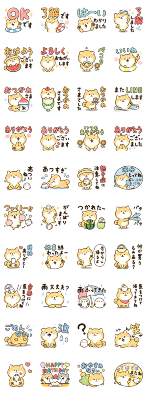 文字が大きくて見やすい、ぽっちゃりした豆しばの夏のスタンプです。敬語も入っているので、日常使いに便利なスタンプです。友達はシマエナガさんです。(犬・豆柴)よつば より発売