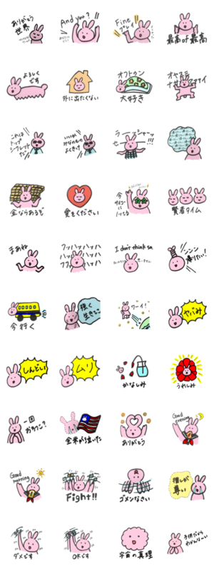 無駄に英語を使いたがる働きたくない系うさぎのうさぎと作者のズボラさがいい塩梅なスタンプです。120円で買ったのに1000円分の働きをしてくれるかもしれないです。ichigotaltotabetai より発売