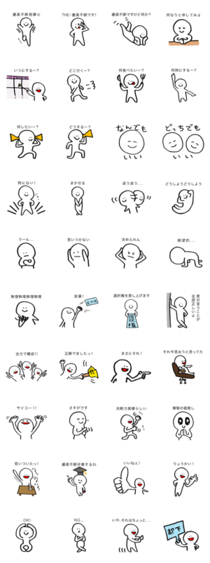 優柔不断の優柔不断による優柔不断のためのスタンプです。 ※相手が優柔不断な場合は、永遠に話が進まない可能性があるのでご注意ください。ぐう より発売