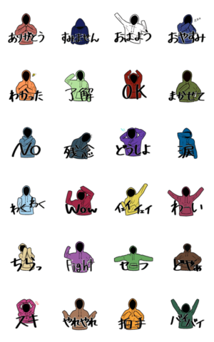 ありがとう、すみません、おはよう、おやすみ、OK、NO、わかった、了解、スキ、バイバイ、まかせて、残念、などのよく使う言葉を動くパーカーのスタンプにしました。