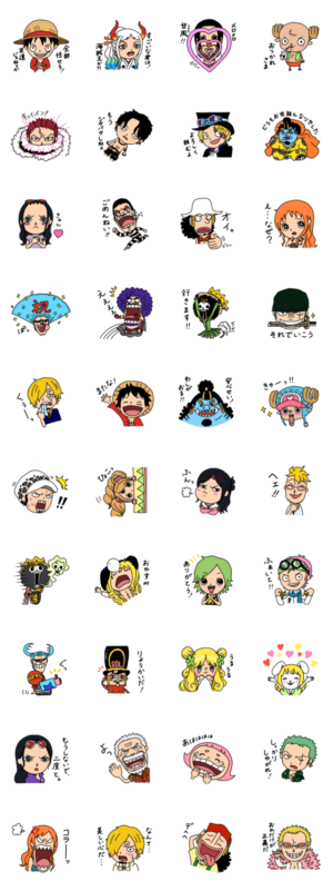 ONE PIECEの愉快な仲間たちによる毎日使えるスタンプです。エース/サボ/ロー/ヤマト/カタクリ/ドフラミンゴ/キャロット/マルコ/ハンコック/コビー/ボン・クレー/プリン他