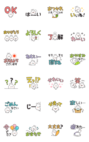 シンプルな白くて可愛い小さなウサギと、大きなサイズで見やすいカラフルな文字が一緒にうごきます♪日常会話にも便利!