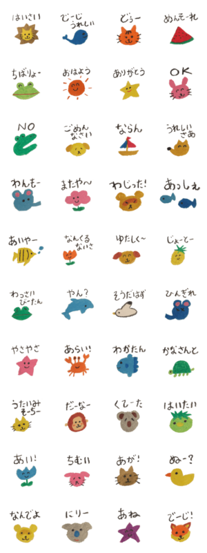 クレヨンでかいた沖縄弁のスタンプです。ぜひ使ってください。ユーカリぱん より発売