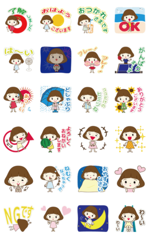 かわいい女の子のスタンプだよ。無難で使いやすい。卓球・チアガール・海・滑り台・花火・夏。敬語・丁寧・日常で使えるよ。mikance より発売