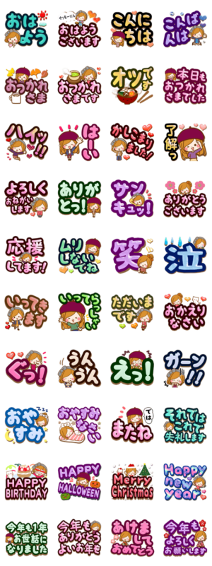 大きな文字が目にやさしい。毎日使える言葉を厳選したデカ文字スタンプです。大人カラーで、誕生日やハロウィン、クリスマスやお正月にも使えるお得なスタンプがいっぱい♪ルルー より発売