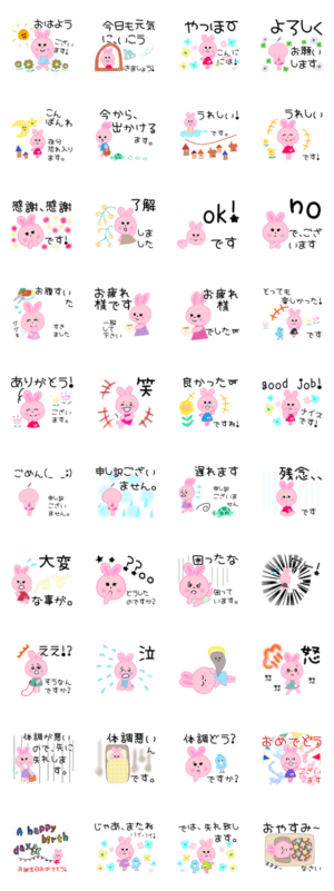 可愛いうさぎのうさこちゃん、日常生活用に朝から寝るまで、毎日つかえるキュートスタンプ。1つの中にカジュアル言葉と敬語も。小中高大専門学生女の子女性主婦バァバ祖母