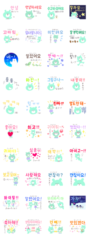 やさしくかわいい、くまさんとおともだちのスタンプです。韓国語(ハングル)と日本語でつくりました。たまに丁寧語・敬語です。毎日のごあいさつやおしゃべりに使ってね。La Belle Saison より発売
