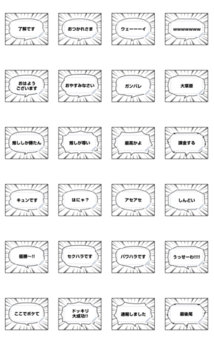 漫画の吹き出しと集中線とコマ割りを用いたスタンプです。24スタンプそれぞれテキストの変更が可能です! 現在この商品は一部のスマートフォン版LINE 10.3.0以上のトークルームでのみ使用できます。動作環境の最新情報はヘルプをご確認ください。くーが より発売