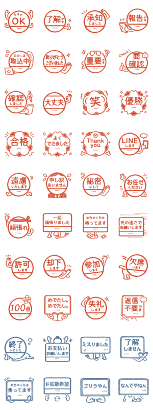 砕けすぎず、丁寧すぎない言葉のカスタムスタンプです。判子/はんこ/ハンコ/よく使う/ネタ/敬語/ツッコミ/仕事/テレワーク/ビジネス/オフィスカジュアル