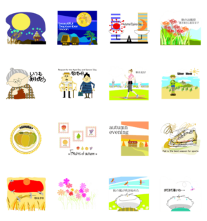 9月に使えるグリーティングカードのようなスタンプ。お月見、秋分の日、お彼岸、敬老の日、秋の果物、秋のスポーツなどのイベント用スタンプmomofuku より発売