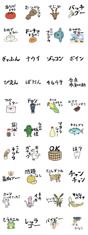 笑える笑えない?駄洒落とイラストと毛筆の文字です。デカ文字で見やすい使いやすい挨拶がいっぱいです。ありがトマト、おつかレンコン、バッチグー、ドロン、合点承知の助