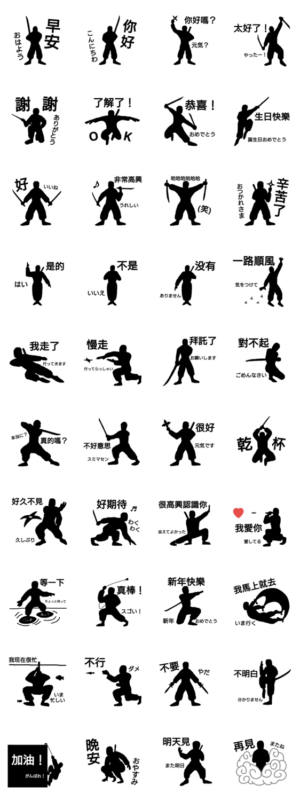 日本語と中国語(繁体字)が一緒に使える忍者のスタンプです。你好や謝謝や我愛你など台湾や香港の方にも使えます。