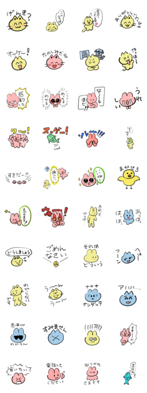 かわいい動物(うさぎ、ねこ、さかな など)のスタンプです。日常会話に使えそうな言葉を入れてみました。ほしめい より発売