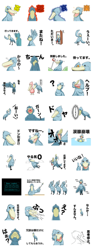 「動かない鳥」で有名なハシビロコウのスタンプ第2弾。キモ可愛い個性的な快鳥をご堪能あれ!
