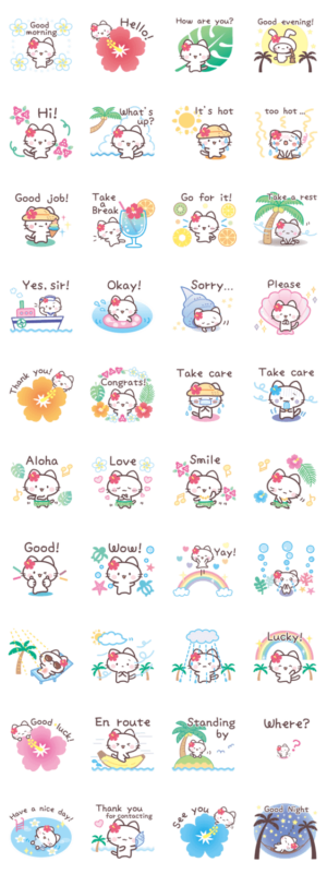 毎日使える英語のスタンプ。 可愛いねこが常夏の島からメッセージを送ります。 夏/ハワイ/挨拶/南の島/癒し/ハワイアン/沖縄/キュート/ハイビスカス/ゆるふわうえはらかずよ より発売