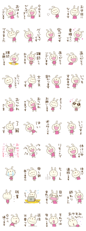 「お世話になります」「了解です」から「残業・・・」まで。仕事の連絡で使いやすいシンプル言葉集。てるてるうさぎで、軽快にメッセージのやりとりをしよう。
