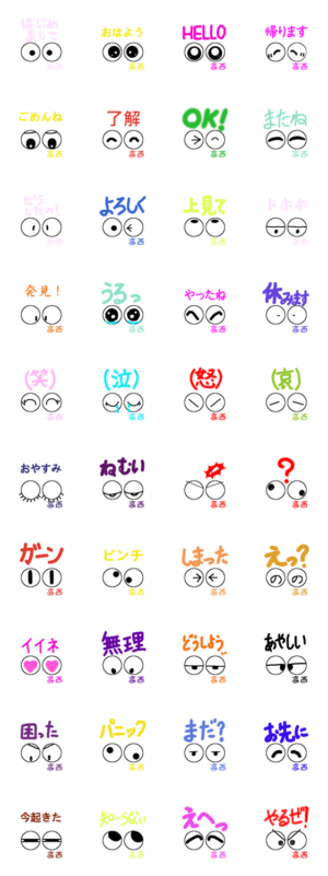 かわいい目玉の日常会話・あいさつ・気持ち 了解 はじめまして おはよう HELLO 帰ります ごめんね またね どうしたの? よろしく 上見て OK トホホ 今起きた