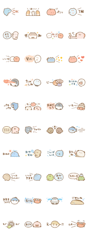海や川で暮らすいきものたちの、トーク画面で幅をとらない省スペースなスタンプです。メンダコ、ペンギン、アザラシ、タコ、イカ、ウツボ、ウーパールーパー、ラッコ、サメ