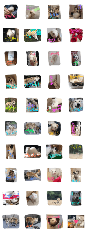 フェレット三姉妹のAgeha(シルバーミット)、ティアラ(シャンパン)、ミルク(アルビノ)と狼犬の牙狼(ウルフドッグ)の日常生活スタンプたにさき より発売