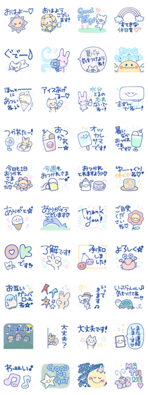 ひんやりとした涼しい色合で夏の暑さが少しでも和ぐようなに作った スタンプです。夏に使える言葉と日常的な言葉を収録した文字の見やすい基本セットです♪ 残暑/敬語などRinko より発売