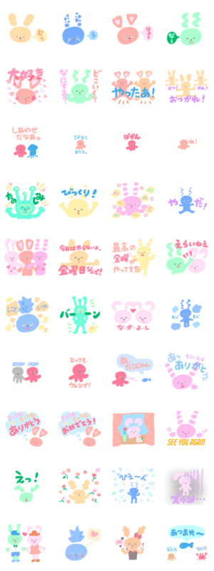 お耳が特徴のカラフルなうさぎと、まるくて小さなたこを題材にしたスタンプです。