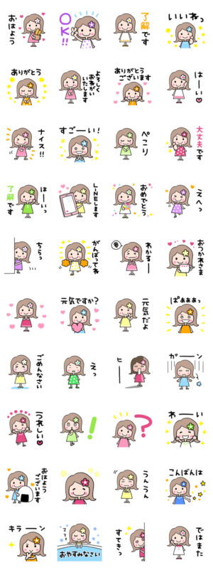 毎日使えるカラフルなワンピースを着た女の子のスタンプです。satomi より発売