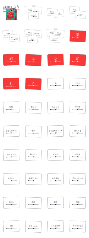 配られたカードでプロポーズの言葉を作るカードゲーム『たった今考えたプロポーズの言葉を君に捧ぐよ。』のLINEスタンプが登場!スタンプを組み合わせて気持ちを伝えよう!