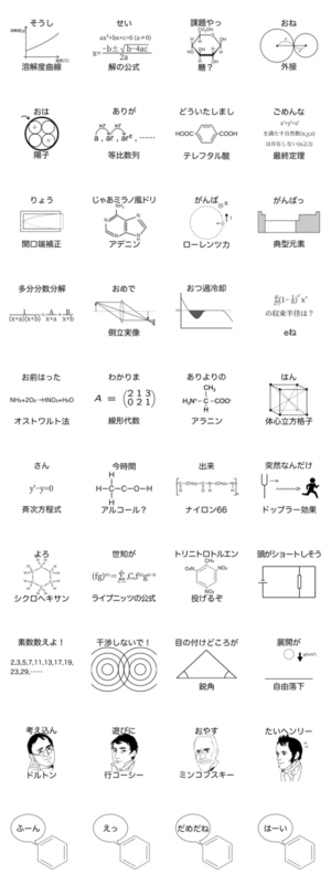 数学、物理、化学の単語を使った理系の人向けのスタンプです。den より発売