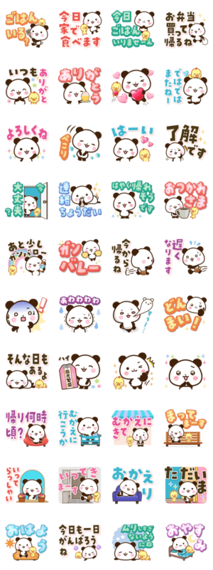 家族ラインで使いやすい文字の入ったパンダとひよこのスタンプです。家族ラインをにぎやかに飾りましょう!!