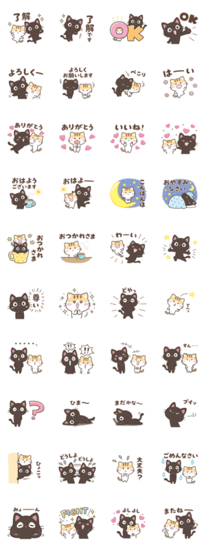 いつもより少しゆるっと可愛い、黒猫のクロと三毛猫のミケのスタンプ第二弾です。