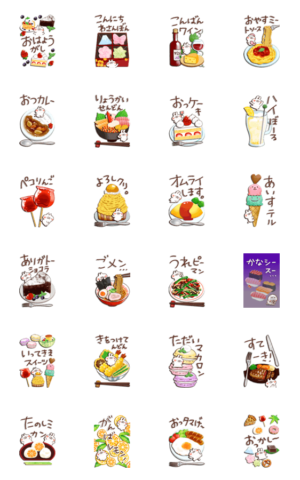 ねことうさぎの名前スタンプシリーズ。食べ物ダジャレスタンプ/ダジャレ/デカ文字/でか文字/でかもじ/飯テロ/死語/猫/とびだす/動く/うごく/山田まぽん作