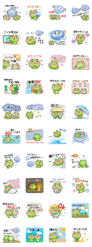 かえるちゃんシリーズ 雨、風、台風、雷、災害など家族や友だちの連絡にも使えるスタンプですcoyuri より発売