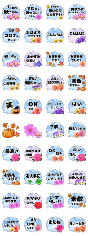 夏から秋に似合う癒しのボタニカル。たくさんの花&コスモスと爽やかな青空にシンプルな会話とやさしい気遣いの敬語、挨拶。大人女子が毎日使いやすい!少しハロウィン入り