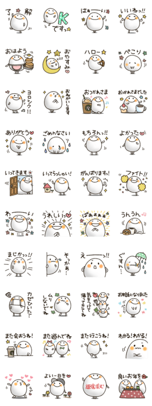 よく使う言葉を集めた、たまご君のスタンプ第二弾です。白くて丸い見やすい使いやすい。良いお年を、また会おうね、気をつけて帰ってきてね、など。