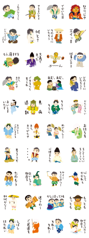 日本の伝統芸能「狂言」のスタンプです。太郎冠者をはじめ、大名や山伏など個性豊かな登場人物が織りなす「笑い」の世界を存分にお楽しみください!KENSYO より発売