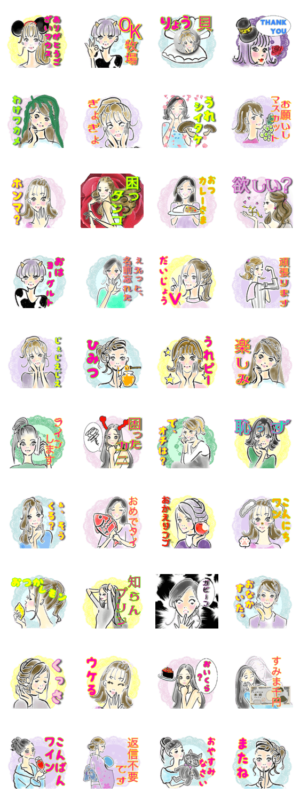 オシャレで可愛い女子のイラストでユーモア入った毎日使えるスタンプです♪オシャレ/可愛い/女子/女性/挨拶/シュール/あいさつ/返事/綺麗/Bnasuko