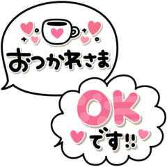 シンプルで可愛いふきだし♡毎日使いやすいスタンプです。 よく使う日常言葉を集めました。 デカ文字BIG/大人可愛い/毎日使う敬語/かわいい/ハート多め/家族/連絡用