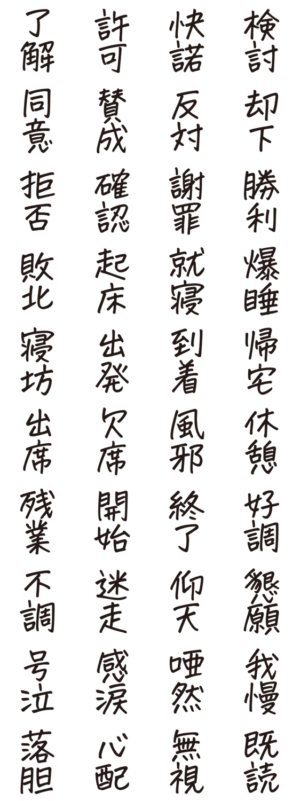 手書き文字。了解、許可、検討、同意、賛成、反対、却下、拒否、確認、謝罪、勝利、起床、爆睡、出発、帰宅、出席、欠席、風邪、好調、号泣、我慢、心配、無視、既読、開始 ※このスタンプはトークルームで大きく表示されるBIGスタンプです。studio-bluedice より発売
