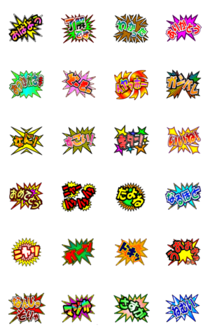 大文字の吹出しスタンプです、おはよう!了解!ありがとう!がんばれ!おめでとう!いいね!など大声で叫ぶ感情を伝えたい時などキャラなしで誰にでも使えます(タグ対応)ハッピーリンク より発売