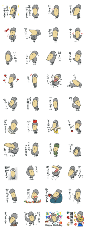 ハシビロコウの毎日便利な言葉と、ダジャレや懐かしい言葉のスタンプです♪お誕生日、お正月スタンプも入ってます。