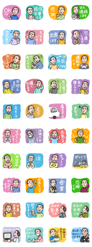 70代の父に似せて作るスタンプ第二弾。似たお顔のお父様方に使っていただだけるとうれしいです。大き目文字のシルバー向けスタンプです。第一弾で足りない語句を追加。